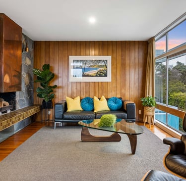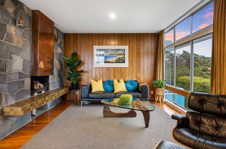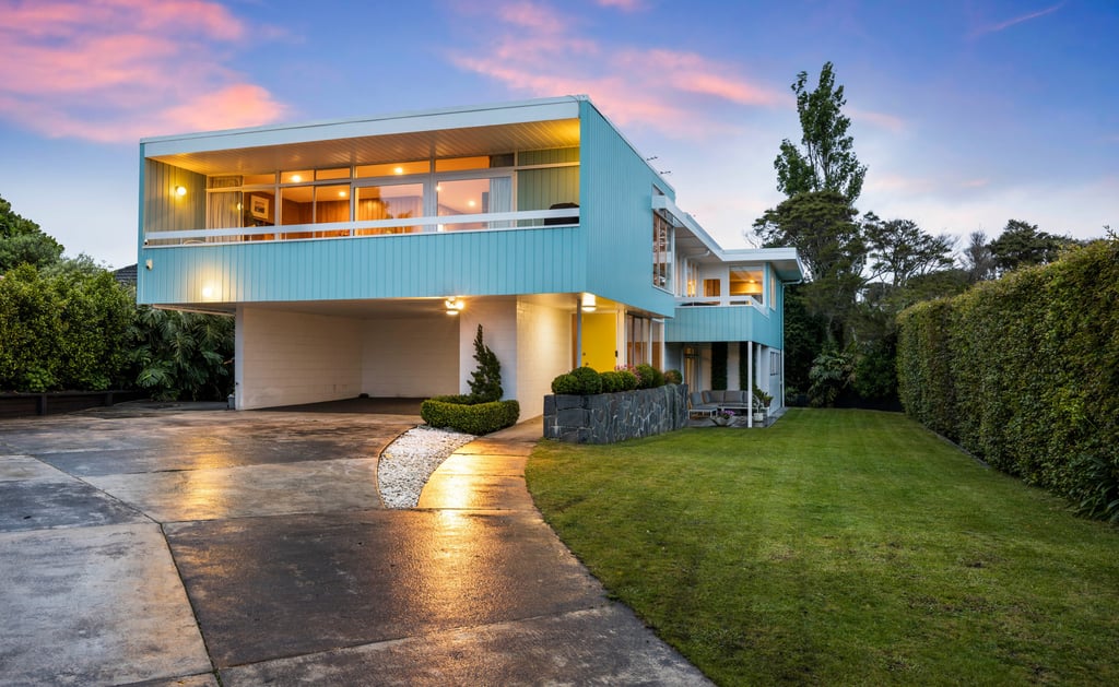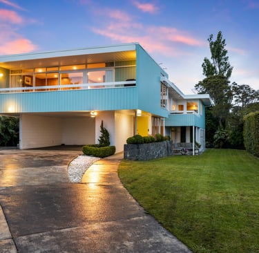 Privately elevated at the end of a quiet cul-de-sac, the Tapper House (1957) is a rare New Zealand modernist landmark by Vladimir Cacala. A residence where international modernism meets a distinctly local sensibility. Its exaggerated rectilinear form appears to float above the site, fronted by full-height sliding windows with crisp grid joinery - timeless, elegant and remarkably current decades on.
