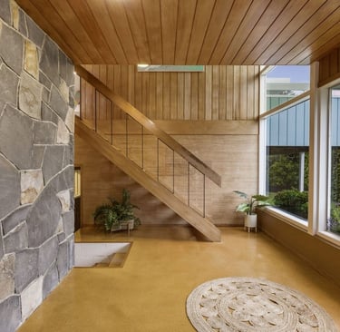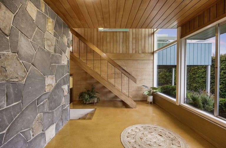 Inside, a dramatic double-height stone wall anchors the plan and choreographs light, flow and separation across the split-level 5-bedroom layout. Tongue-and-groove panelling, old-growth timber floors and seagrass wall coverings enrich the calm, gallery-like atmosphere.